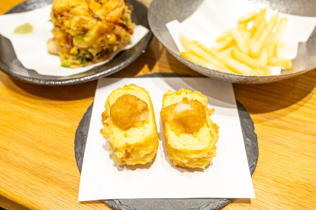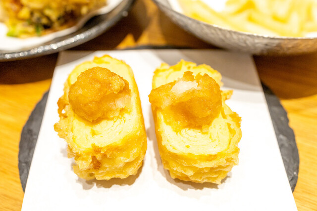 普段なかなか食べる機会がない面白い天ぷらがあります。そのひとつが出汁巻玉子の天ぷらですね。本当に出汁巻玉子をそのまま揚げているのです。おろし醤油を付けていただくのですが揚げることによって玉子の風味が濃くなる気がしますね。