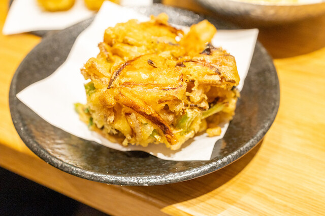 かき揚げメニューが充実していてかき揚げだけで4種類もメニューがありました。変わり種メニューもあってのですが、ここは普通に小柱と小海老のかき揚げをセレクト。分厚いかき揚げなのに衣がサクサクなのです。わさび塩を付けていただくのでピリ辛が口の中を爽やかにしてくれますね。