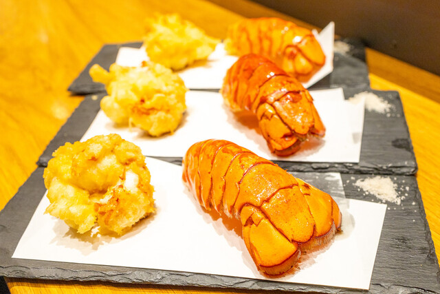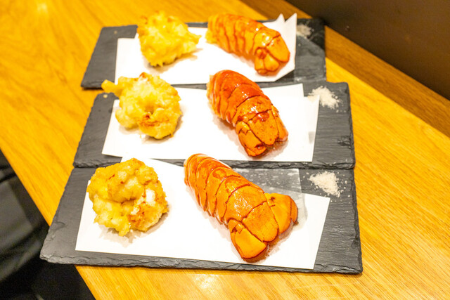 数量限定メニューなので早めに注文するのが良さげです。まん丸く整形したオマール海老はプリプリ食感で美味しいですね。トリュフ塩がまた香りが良くて旨味が増しますね。