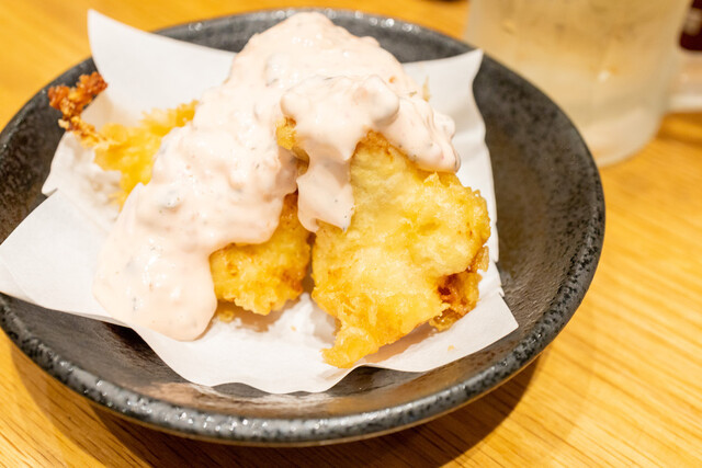 こちらも面白いですね。とり天なのですがソースがしば漬けタルタルソースになっています。タルタルのこってり風味としば漬けの食感と塩気がいい感じで合うのです。無限ループでパクパク食べてしまうやつですね。