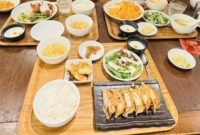 餃子とサラダ、ご飯、スープ、杏仁...