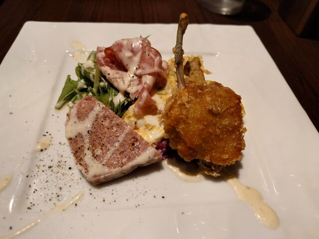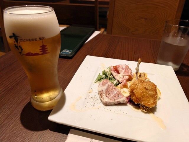 盛り合わせはキッシュ、豚のテリーヌ、生ハムなどオーソドックスな組み合わせながら酒のアテには最高です