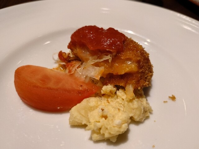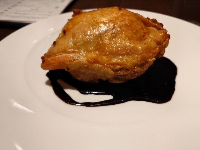 表面がパリパリのチキンと少し苦いコクのあるデミグラスソース