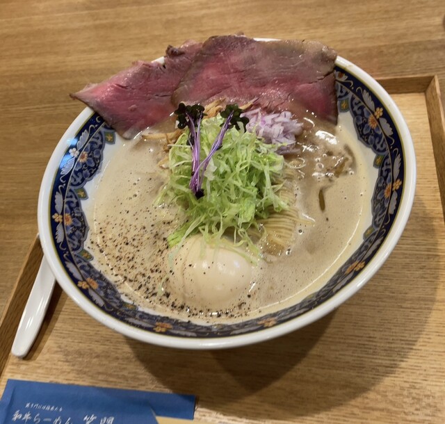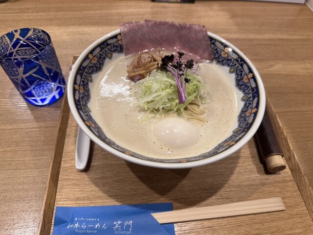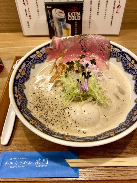 京都・丸太町駅から徒歩30秒。和牛らーめん笑門は、松阪牛の旨みを凝縮した濃厚スープに、京都の老舗製麺所「棣鄂(ていがく)」の厳選麺を合わせた、他では味わえない一杯をご提供いたします。芳醇な香りと上質なコクが織りなす味わいは、多くの日本人のお客様からも高く評価されています。特別な一日を彩る贅沢なラーメンを、ぜひ当店でご堪能ください。