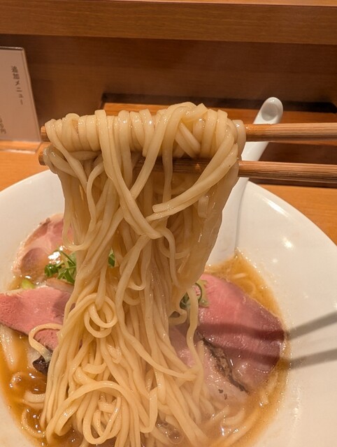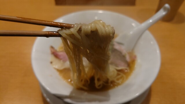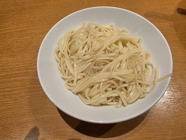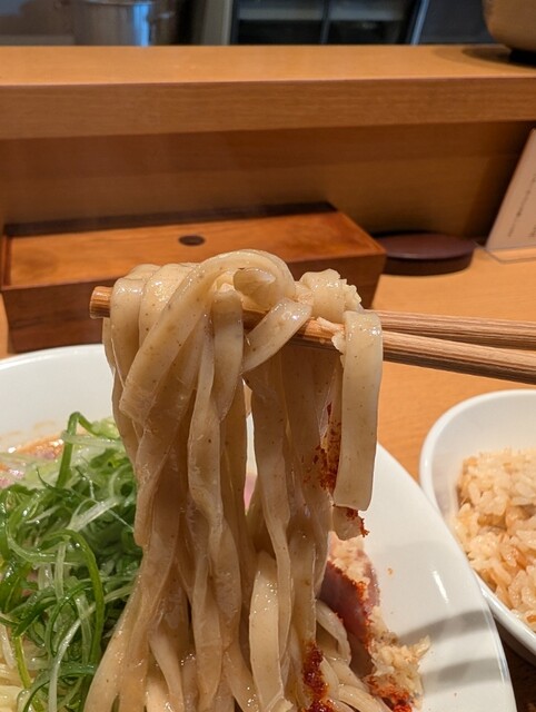 麺はつるっとしたモチモチ食感の、中細やや平打ち麺と、ややパツパツとした平打ち太麺です。