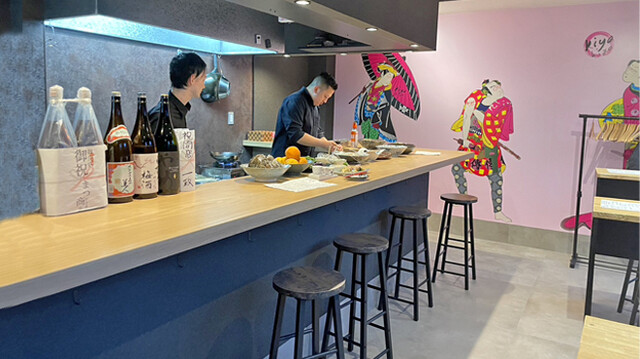 ”より気軽に、よりお洒落に”がコンセプトの京都の和食スタンドバルです。14時から営業しており、昼からのひとり飲みや友人とのお集まりにピッタリ!京都の食材を使ったおばんざいや厳選された30種類以上の地酒を楽しみながら、浮世絵などのウォールアートが印象的な和モダンな店内でゆったりとお過ごしください。立ち飲みスタイルですが、椅子のご用意もございますので座ってゆっくり楽しむことも可能です。