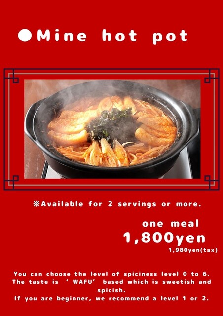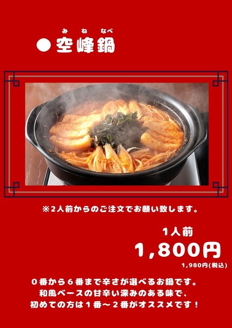 空峰鍋(みねなべ)というイメージできないメニューがメインのようだったので、これまで関心がなかった。たまたま行ってみようと思って初めて訪問。選択肢が無く空峰鍋を注文。メニューには鍋は2人から注文と記載されていたが1人からでもOKだそうです(NGだったら注文するものがほとんど無い)。