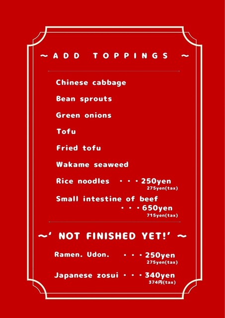 | サービス | ハッピーアワー、複数言語メニューあり(英語) |