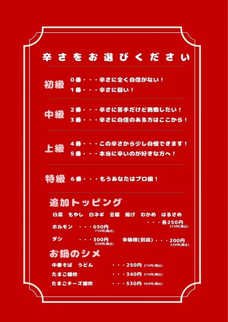 鍋のスープの辛さを2番にした。スープは辛さと甘味のある辛旨な印象。ホルモンの数は全体的に少なく具が少ない印象。鍋の〆...
