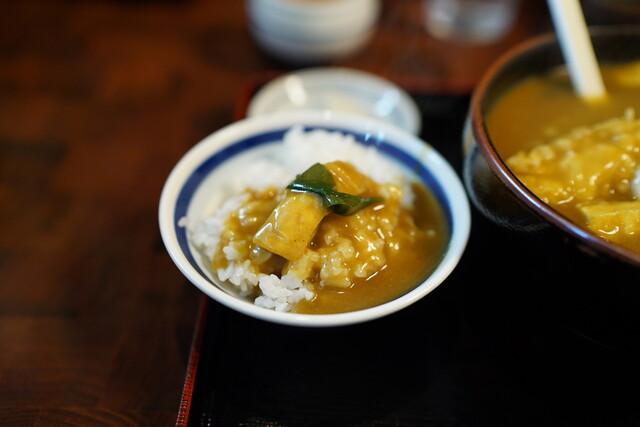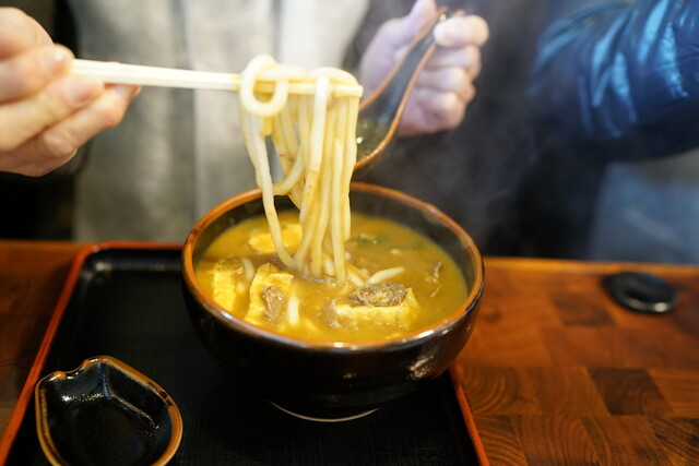 輸入スパイス粉を使用し、ラードを主軸とした濃厚な特製ルウを1日掛けて練り上げる。これが驚くほどまろやかでコク深い味わいのベースになる。ダシもしっかりと効かせて、具はシンプルにネギと牛肉とタマネギ、そして油揚げ。もっちりしたうどんに、カレーがまったりと絡みつく。一口すすり終わらぬうちに、次のもう一口が欲しくなる。観光のガイジンさんも、店を出る時にはニンマリ笑って満足の味。仕事の合間合間に、明日の分の...ルウを仕込んでおく。スパイスを馴染ませることで、さらに味が丸くなっていくのだ。特カレーうどん900円、揚げきざみうどん650円、ワカメ入りカレーうどん750円なども。