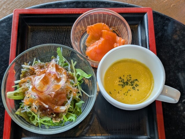 まず前菜のスモークサーモン、サラダ、スープが出てきます。お肉は国産牛60gですが、ちゃんとファイヤータイムがあって焼き野菜とガーリックチップ...