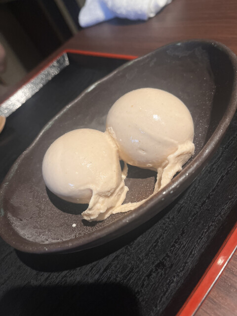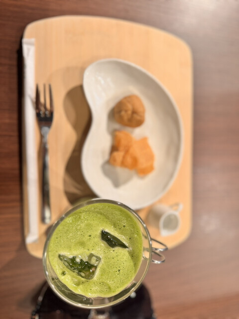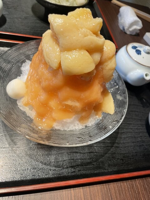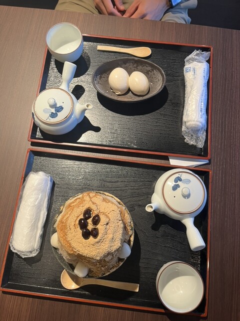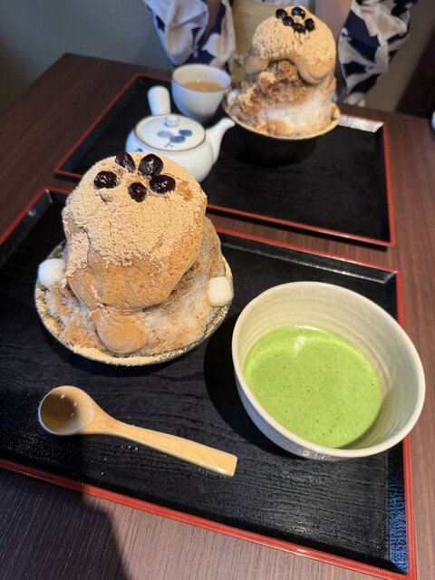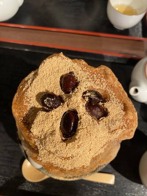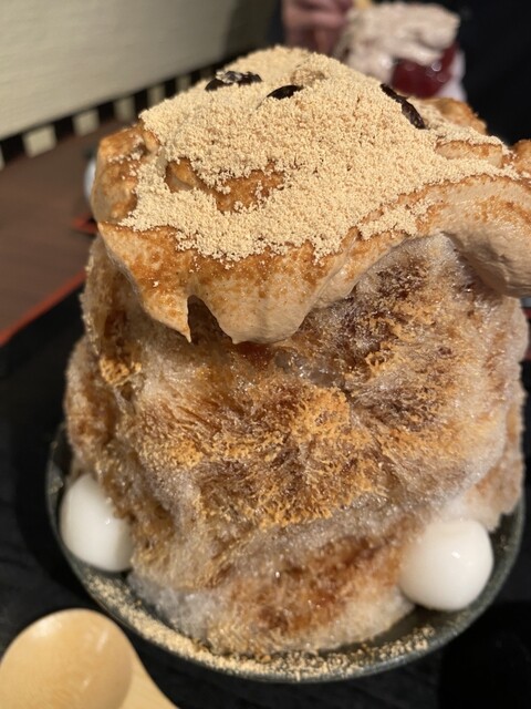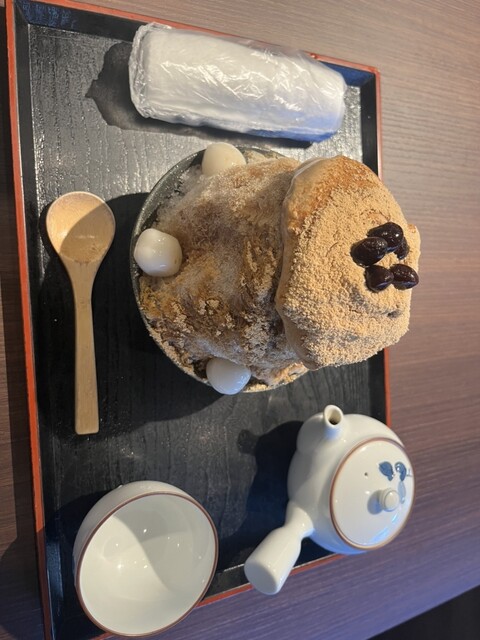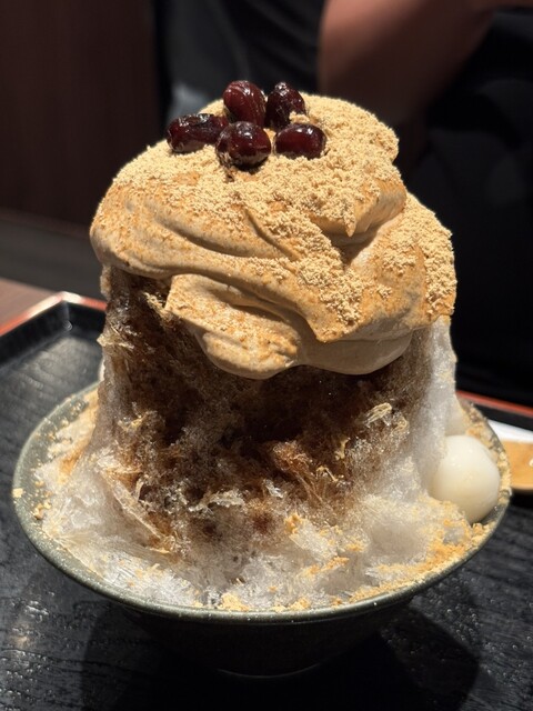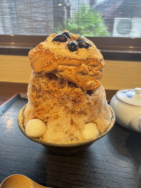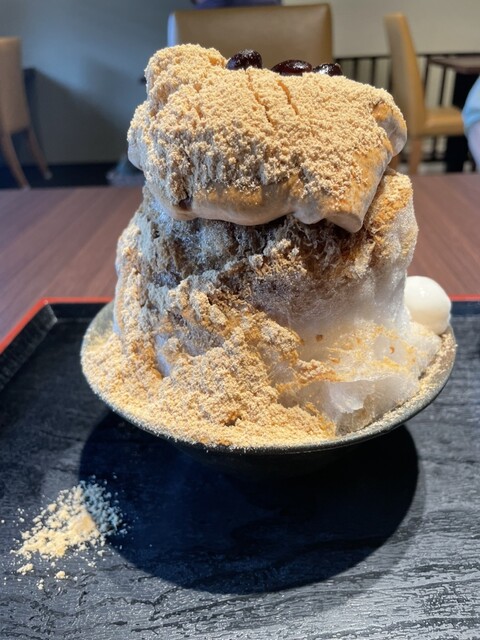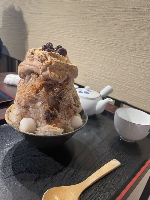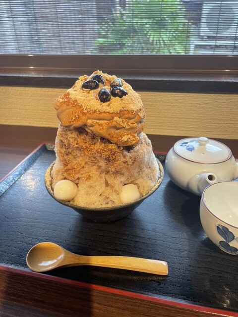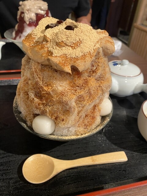 きな粉のかき氷(お抹茶セット)を注文。かき氷はきな粉クリームと合わさって甘く、クリーミーで美味しかった。氷の中にバニラアイス、コーヒーゼリー(?)も入っていたので最後まで飽きることなく美味しく食べれた...