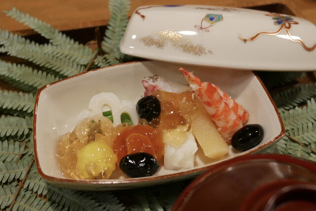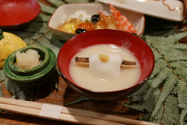 昆布茶 瓶ビール サッポロ赤星 お節 井戸水と橙のジュレかけ 車海老 干し柿 くわい 菊蕪 蓮根 黒豆 うるい 数の子 鯛の松葉造り 等々 お雑煮 白味噌仕立て(辛子) 餅 里芋 牛蒡 ナマコ酢みぞれ和え 蒸し寿司 穴子 錦糸玉子 ... 詳細を見る