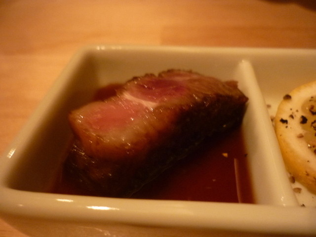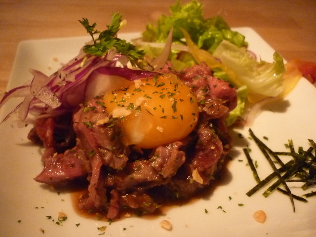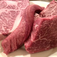 美味しいお肉食べたくて、サクッと検索して当日開店間近に電話予約。通路の先のエレベーターで2階へ!気さくな感じの店主?さんが出迎え頂きました。メニューもありますが、基本的にはお任せのお店とのことなので、要望を伝えおまかせで!チーズ、生ハムで前菜。サラダ、A5炙りユッケ、など頼み、メインは肉のフィレとロース?二種のステーキで!国産のフィレとロース?とのこと。B.M.Sはあまり高くないかな?味は塩、ボン...