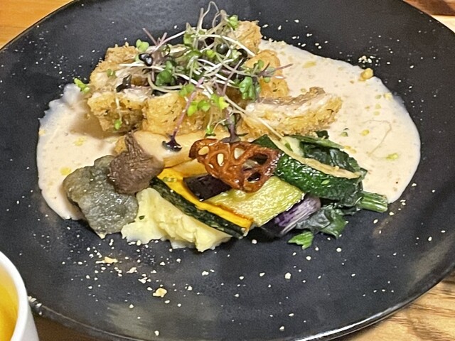 素揚げした野菜が盛り付けられ、香ばしい太刀魚とよく合います