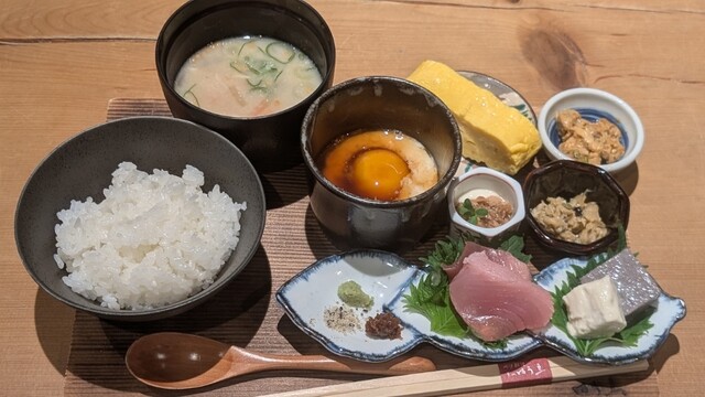 ゆう豆名物の湯葉たまご飯を朝食から!! 製造もこなす社長が昔から食べていた生産者の秘伝のご飯!! 朝の行動前にお腹に優しい朝食をどうぞ♩