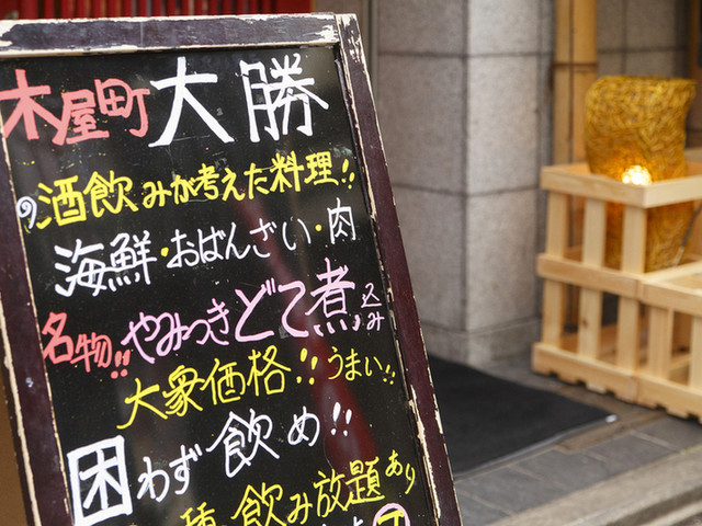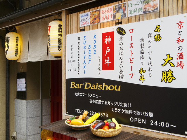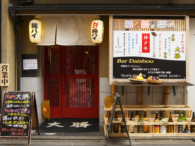 【京と和の酒場 大勝】お店の前に出した大きな提灯が目安です。決して大きなお店ではありませんが、その分店内は賑わいを見せ、活気があふれる印象。お店のコンセプト通りの「大衆酒場」という言葉がそのまま当てはまります。このお店で提供される料理は、どれも手の込んだ一品料理の数々。名物の「おでん」から、店主手作りのおばんざいまで!食事はもちろんのことながら、深夜には照明の色も変わり、バーに切り替わる二面性も。...カラオケも無料で利用できるなど、酒飲みならずとも、朝まで楽しめる空間づくりにこだわっています。