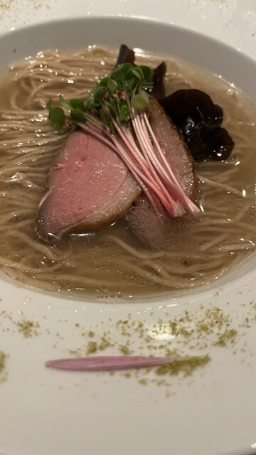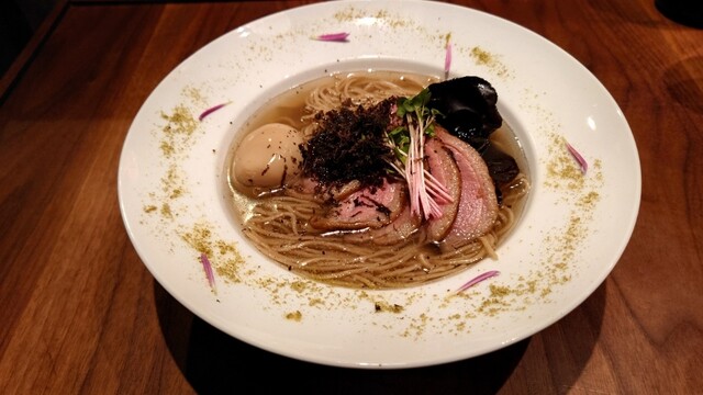 平飼いでのびのびと育てられた鴨は脂ののりが良く、赤身もきめ細やかです。そんな鴨の旨みを余すことなく活かした、フレンチ出身のシェフが生み出す鴨のラーメンは絶品!麺は鴨の旨みに負けないよう、ドイツ産ライ麦を使った風味豊かな全粒粉麺を採用、香り高いぶどう山椒で飾り付け、美しく美味しい一杯に!