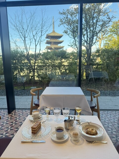 当店自慢の大きな窓からの景色をお楽しみいただけたようで何よりです。窓の外にそびえるのは、*東山のシンボルである法観寺「八坂の塔」でございます。古都の情緒あふれるこの眺望とともにフレンチを愉しむ時間は、私共もぜひお客様に味わっていただきたい「京都店ならではの特別感」でございます。