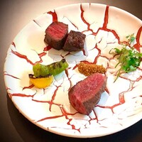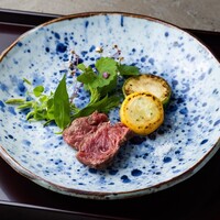 薪と炭で丁寧に火入れした熟成肉ステーキを、旬の素材と仕立てます。季節の移ろいを五感でご堪能。オーナーシェフの故郷から近江牛を中心に但馬牛、ジャージー牛、様々な肉の旨味を多様な調理方法で引き出します。肉の新しい体験と共に、厳選した日本酒とワインを傾けながら、会話が弾むカウンターで特別なひとときをお楽しみ頂けます。ランチ8~10皿、ディナー11~13皿