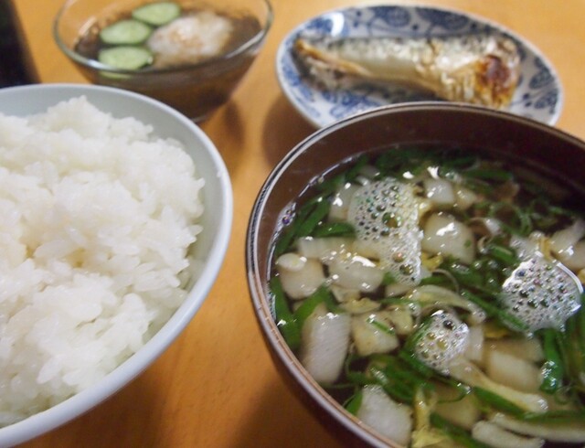 ごはんに汁もの(今回はかす汁)、お好みのおかず一品、卵、味つけ海苔と