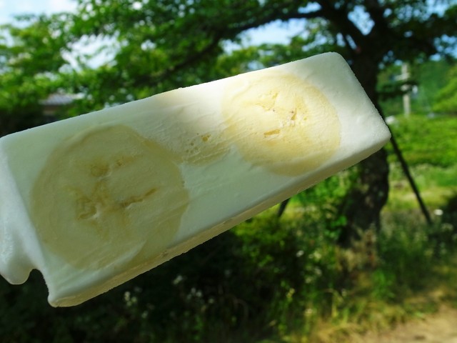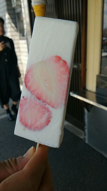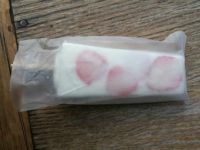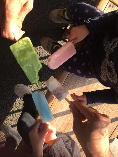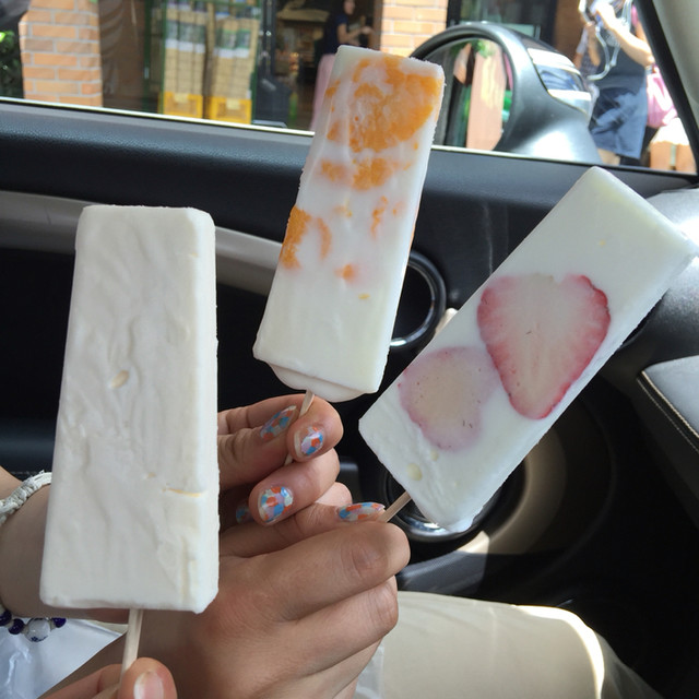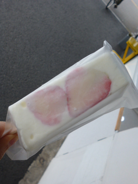 サイクリング途中のオヤツに チビズ、イチゴ、ソーダ 旦那さん、小豆×バニラ 私、抹茶
