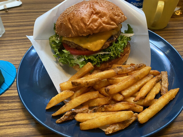 ハンバーガーはTAKEOUTできます(フライドポテト付き) |