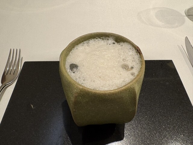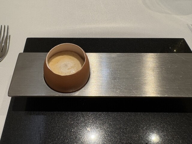 今回が二度目の来店。スタートは、野菜のコンソメ。優しい味で胃を温めてくれる。次がこの店のスペシャリテで、半熟に仕上げた卵にクリームを加えたもの。シルキーで滑らかなこの仕上げにどれだけ手間が掛かっている...