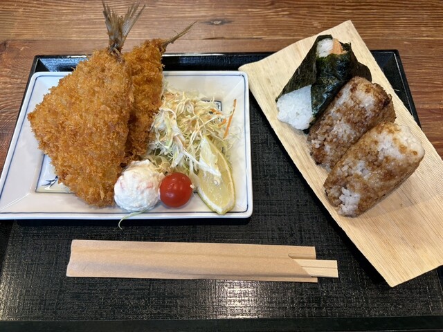 注文したのは初志貫徹のアジフライに、焼きおにぎりと白味噌明太子。
