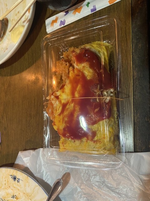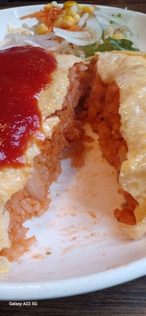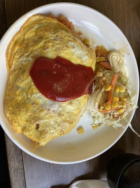 具が少なくて、ライスがめっちゃ多く、ケチャップ味の濃い学生向けのオムライスです。レギュラーで1合くらいあります。