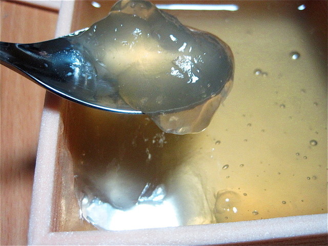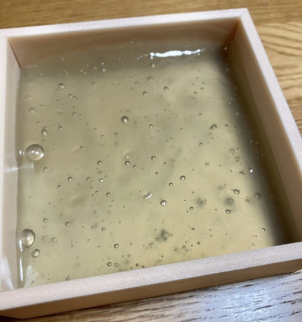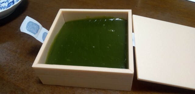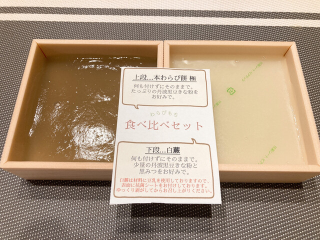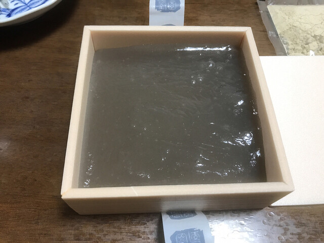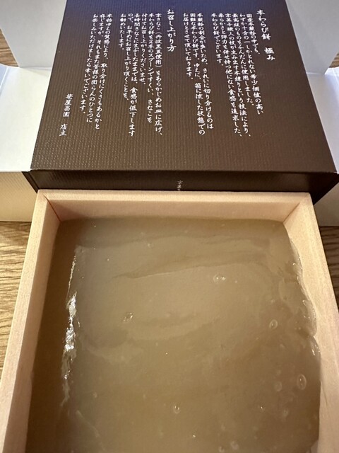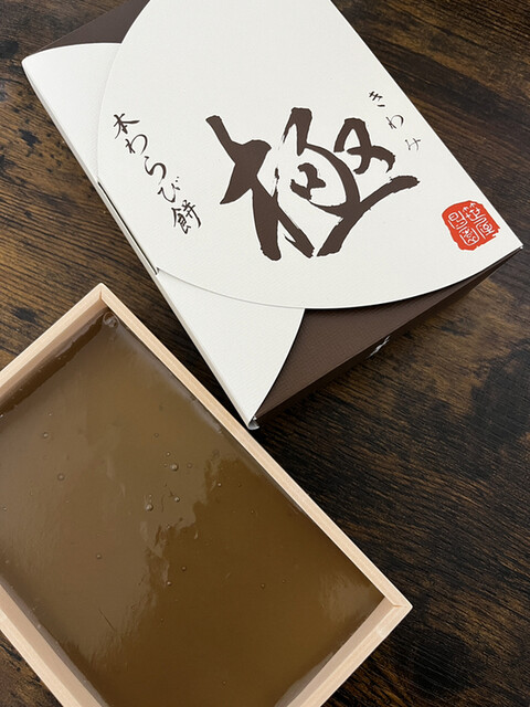 本わらび餅を購入しました国産の本蕨粉の中でもわずかしか採れない国産最高ランクです 本蕨粉の割合が多いのでなかなかきれいに切れません箱に流した状態でしたトロリトロトロです食べるのがもったいない品です熟練職人の手作りです
