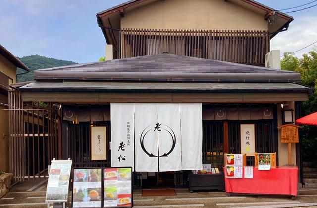 京都府京都市右京区嵯峨天龍寺芒ノ馬場町にある老松 嵐山店にお伺いしました。京福電鉄 嵐電嵐山駅から徒歩約3分、JR山陰本線 嵯峨嵐山駅の南口から徒歩約10分、阪急 嵐山線 阪急嵐山駅から徒歩約12分のところにあるので、公共交通機関からアクセスしやすいです。駐車場はありませんが、近くにはコインパーキングがあるので、自動車でのアクセスも便利です。