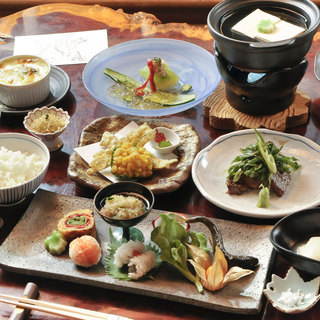 ・先付け ・八寸盛り ・季節の京料理 ・創作の一品 ・樋湯葉と季節の揚物 ・生麸のグラタン ・湯豆腐 ・和牛ヘレのミニステーキ ・揚げ出し豆腐 ・ご飯 香の物 ・ちりめん山椒 ・デザート |