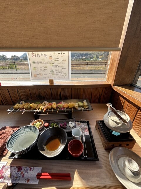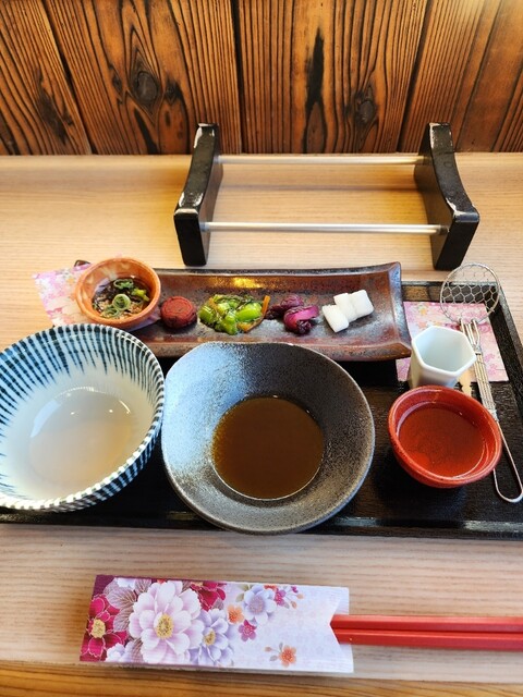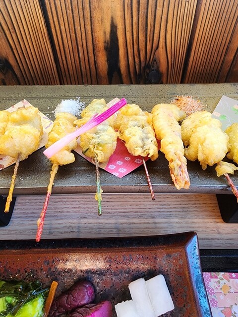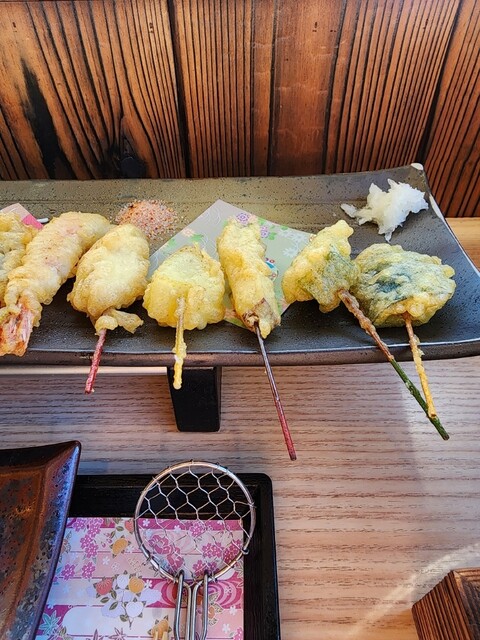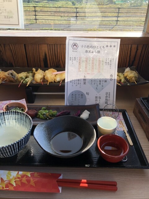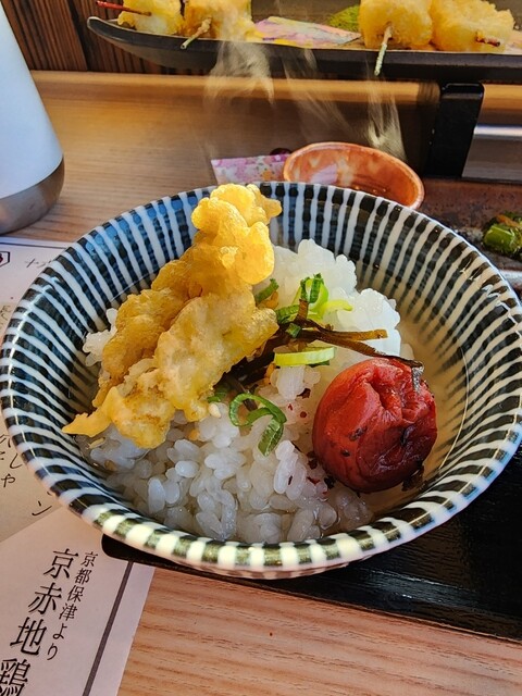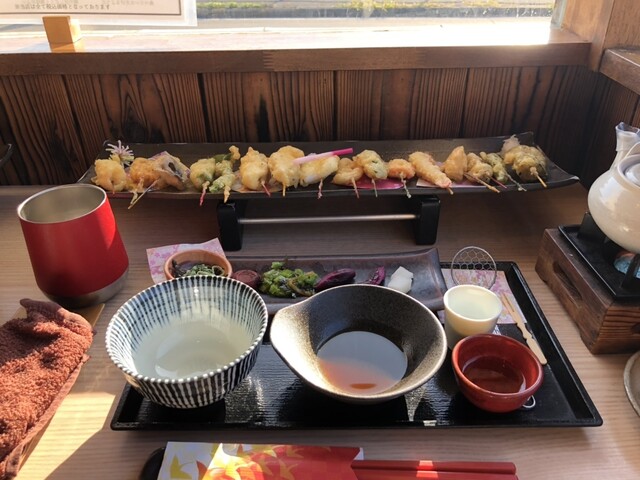 桂川沿いにある串天ぷらのお店。 【土瓶蒸しと十六色の一口天ぷら膳】3,300円 ・土瓶蒸し 嵐山店のみで食べられる。 京赤地鶏のつみれ、京豆腐、野菜が入っている鯛出汁の... 詳細を見る