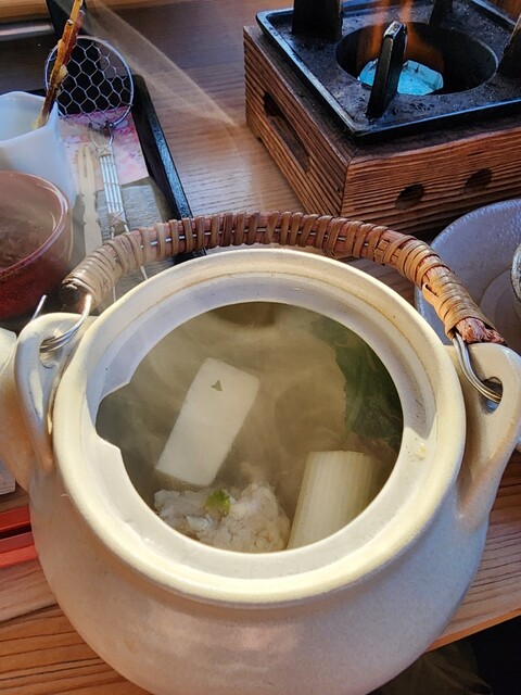 京赤地鶏のつみれ、京豆腐、野菜が入っている鯛出汁の土瓶蒸し。松茸の土瓶蒸しとは異なるが、鯛の風味と鶏の旨味が溶け込みしっかりとした味わい。