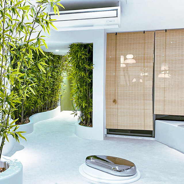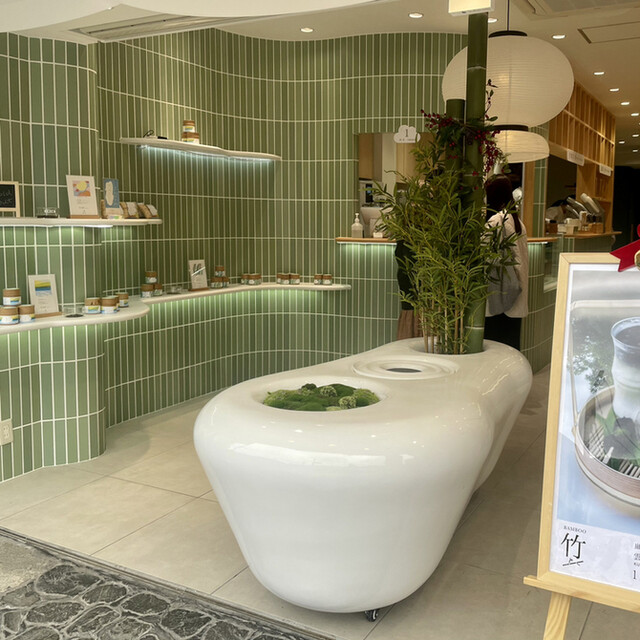 店内は、京都嵐山の代表的な観光名所のひとつ「竹林」をイメージした緑があふれる空間。