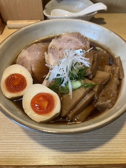 醤油ラーメン 煮卵 チャーシュー増し 1200 西大路丸太町上る 金閣寺行き バス停前に位置する当店は、ラーメン激戦区、京都で長年100名店に選出される実力店。 久しぶりにお伺いし、今回頂いたのは定番の醤油ラーメン( チャーシュー増し、煮卵付き)。 麺は柔らかくなめらかで、 鶏ガラと和風だし... 詳細を見る