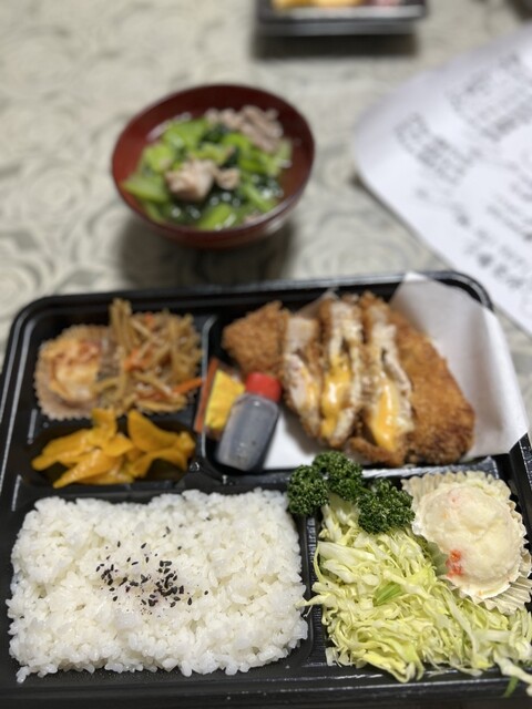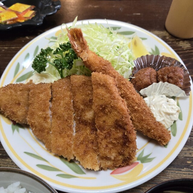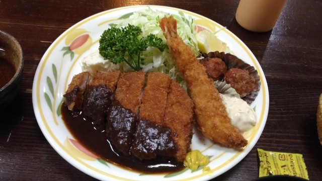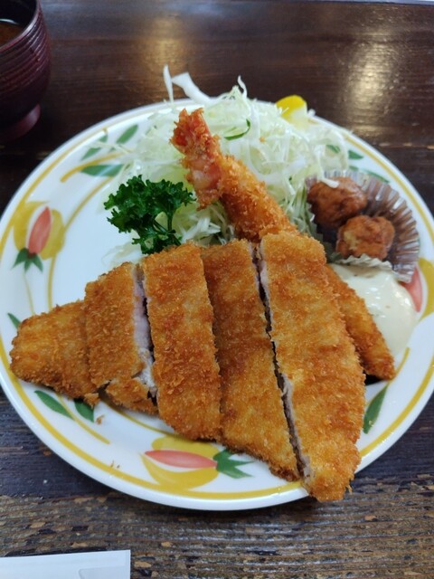 15年以上前に行ったことあるお好み焼きのお店に行こうと思ってバスに揺られ京都駅から40分。お店はあったがテイクアウト専門店に変わっていた。せっかく来たのにランチ難民に。すると隣にこのお店が。まさに救世主。名古屋出身のホール担当オバチャンのオススメでロースカツ定食デラックス@1300円を注文。安すぎませんか?エビフライは@100でサービスでしょうか。更にミートボール2個、ポテトサラダ、お新香味噌汁付...