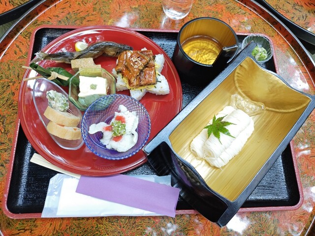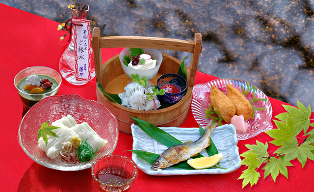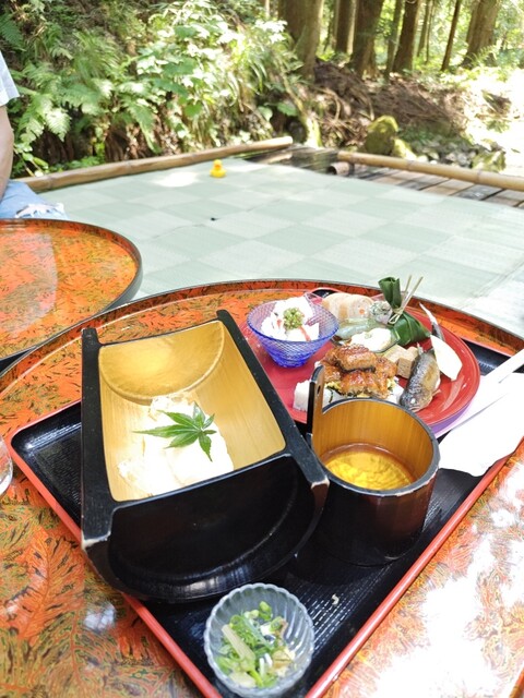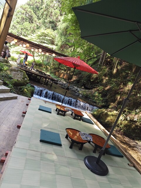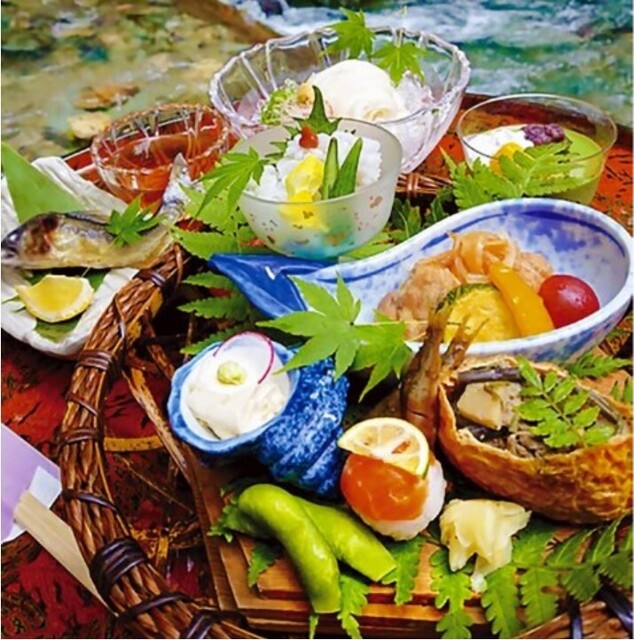 貴船神社と貴船口駅のちょうど真ん中に店を構える【古今藤や】。当店では、伝統を引き継ぎつつ現代のお客様のニーズを取り入れた”カフェ&川床料理”をお召し上がりいただけます。そうめんと鮎を味わえる「せせらぎセット」やパフェ・プリンなどのスイーツをご用意♪また、景色を眺めながら川床でご堪能いただける「山水家膳」もご提供しております。10:30~21:00まで通しで営業しておりますのでお気軽にご利用ください