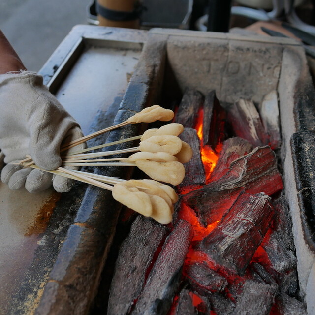 店先では、職人さんが手際よくお餅を炙っています。炭火の熱と、店内のレトロなストーブの暖かさが、冷え切った体に心地よく染み渡ります。