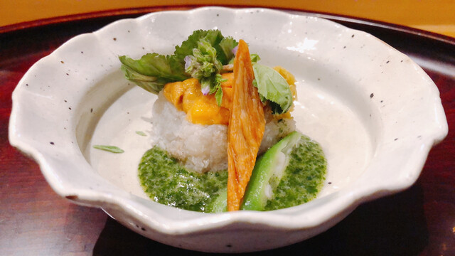 手のかかった料理が次々に登場します。魚も野菜も、ジビエの鹿も、それぞれが主役です。若水菜とせいこがにのほぐし身の...