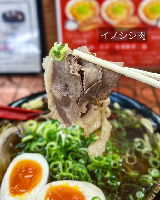 猪肉は疲労回復によいビタミン群が多く、そのうえ脂肪は悪玉コレステロールを抑えるはたらきのある不飽和脂肪酸なのでヘルシー 看板メニュー『いのししラーメン』こだわる具材は丹波一帯でとれたいのししは栗、どんぐり、栃の実を多く、食しているので、よく脂がのりとてもおいしいです。