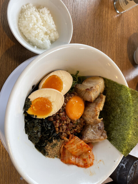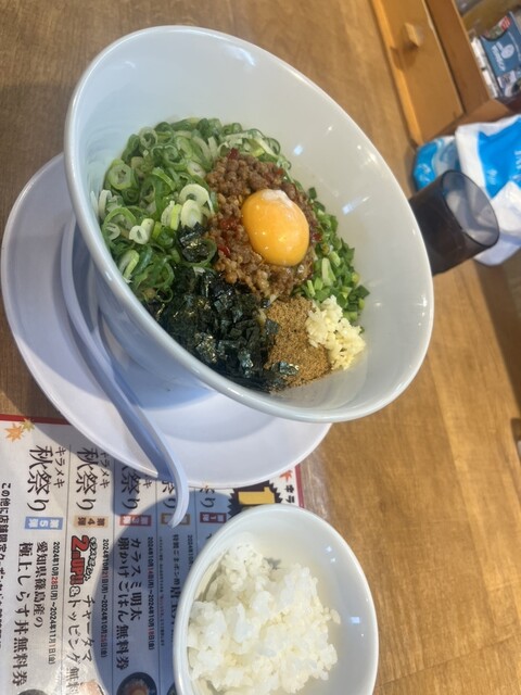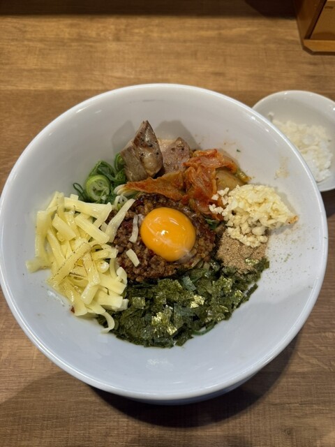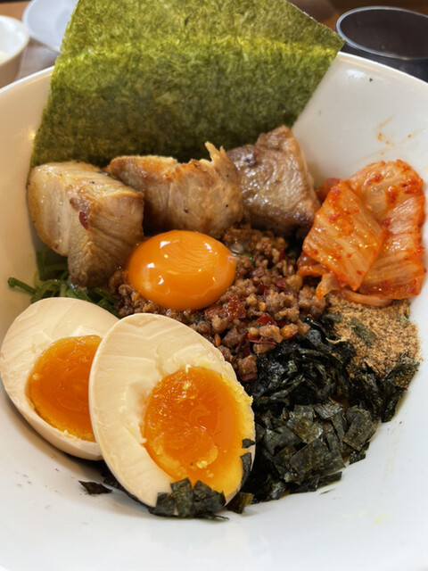 土曜日の11時15分に訪問、先客3名。最近は開店前に行列になることもほとんどないね。 極濃鶏白湯まぜそば〝GTM〟DX(特大)(1470円)ニンニク有り。見た目がジャンク。 ... 詳細を見る