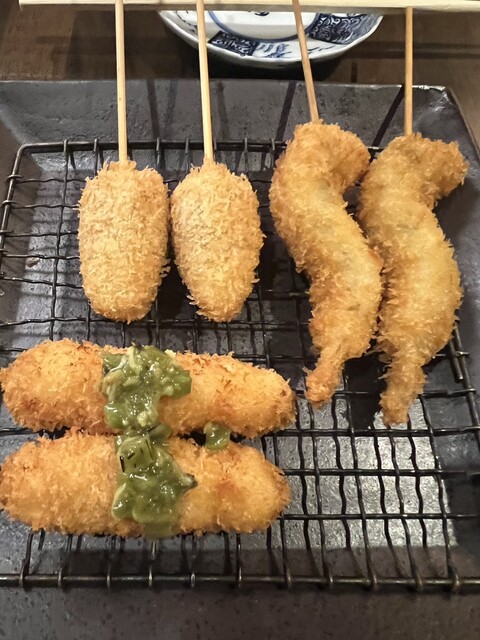 当店自慢の「串揚げ」は、旬の素材をシンプルに素材の味を活かした、揚げたて・サクサク。また、昔ながらの味を楽しめる「おばんざい」とワイングラスで飲んでいただく冷酒も人気です。