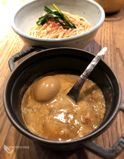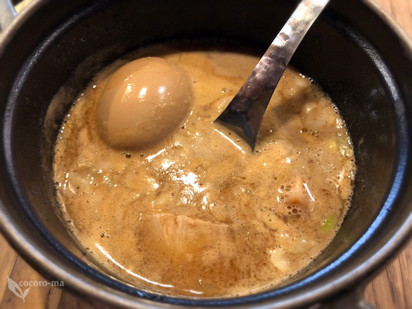 つけ麺専門店[麺や高倉二条]の最終兵器的支店。このもつそば(卵付き850円)はスープに投入された炙りホソの旨みをさらに生かすため、鶏と煮干しのWスープを新たに開発。箸で持てるほどのハリと風味を持つ特選卵は、途中で飽きがちなつけ麺の味を変化させるための小道具だ。まずはプチッと黄身の薄皮を破り、流れ出すまったりとしたコクを全粒粉麺とともに絡めれば…。上級者はそば×スープ×卵を楽しんだ後、卵の器にそばを...入れ残ったスープを投入するのだとか。しかし直接スープに投入するのは「味がボケる」のでご注意を。