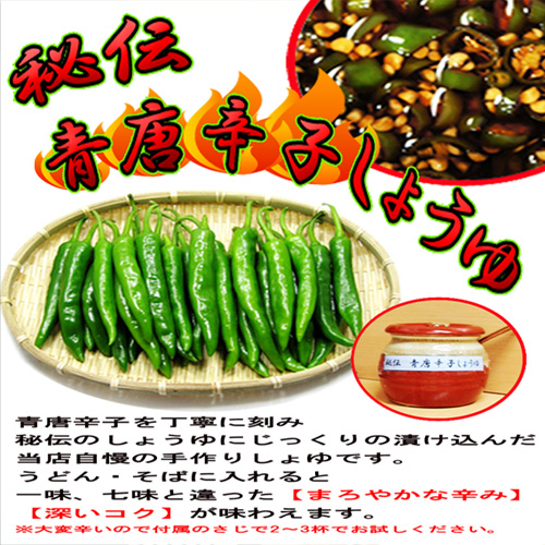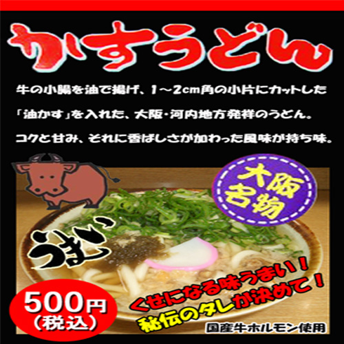 出汁が好評の【うどん・そば】 大阪の有名精肉店の【和牛コロッケ】 熟練の料理人がつくる【手作りカレー】 がおススメです。 是非、一度ご来店下さい。 お酒もリーズナブルに楽しめます♪ 【名物かすうどん】は必ず食べて下さい((笑)) 牛の内臓を揚げた油かす・トロロ昆布、柚子の皮、かすうどん専用の秘伝タレが出汁に絶妙にマッチします。常連のファンの方はオニギリも一緒に食べて頂いています。 本場大阪にも引け...を取りません!!病みつきになる味!!ハマります!! 只今、油かす増量中です。この機会にお立ち寄りください。お待ちしております♪ ※2004/7/1より特製・青唐辛子醤油を無料でお試し頂けます。 青唐辛子を丁寧に刻み、秘伝の返し醤油に漬け込みました。 うどん・そばに入れると一味や七味と違った辛みとコクが増します。