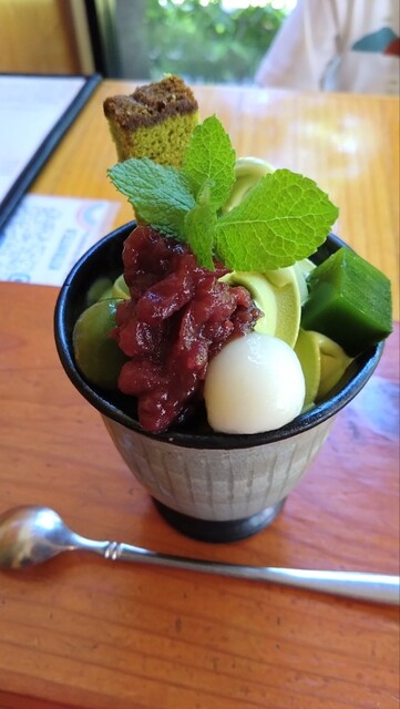 良い感じの陶器の器に盛られたパフェは、少し小ぶりで丁度良いサイズ感!