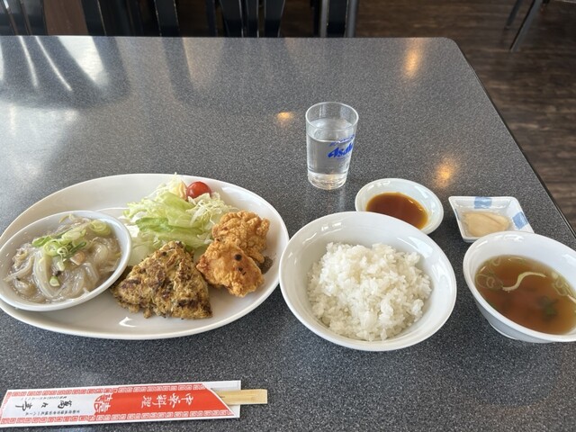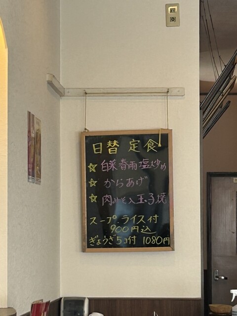 日替り定食(白菜春雨塩炒め、大きめの唐揚げ2個、肉味噌入り玉子焼、野菜少々がのったワンプレーに、スープ、ライスがついて900円)、それに+180円で餃子5個を注文しました。