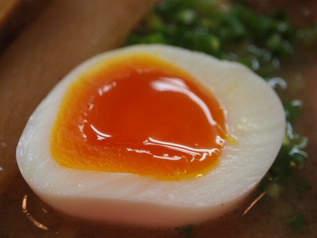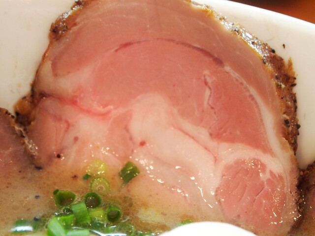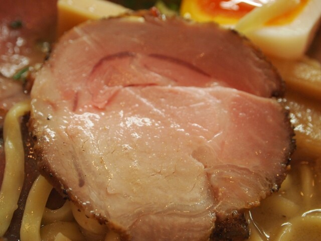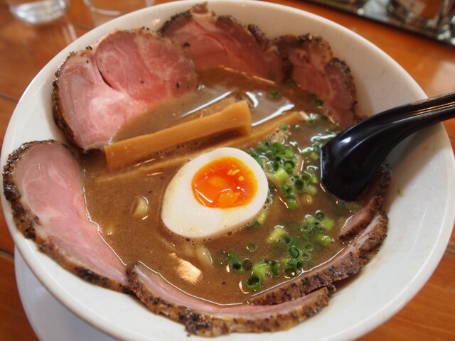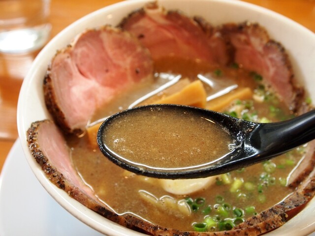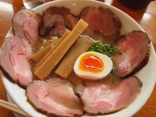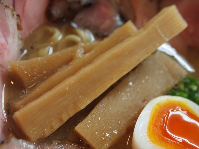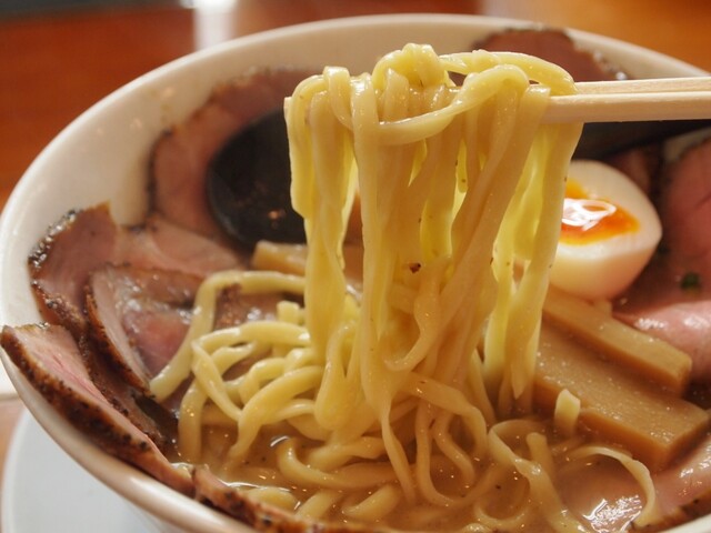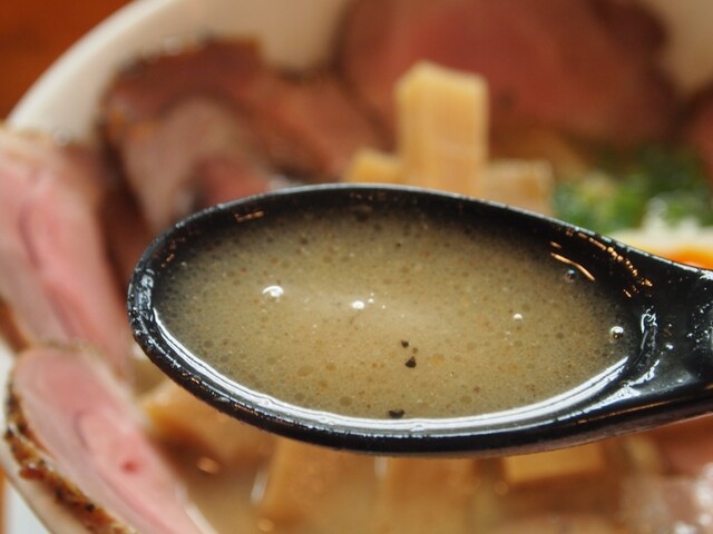 スープはふんわり泡立つクリーミー系で、最初に魚介の香りが立ち、そのあと動物系の濃厚でマイルドな旨みが広がります。胡椒オイルを数滴垂らせばパンチが加わり、最後まで飽きずに...