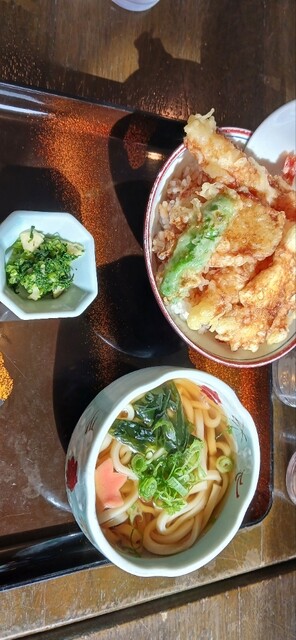 料理は天丼とうどんのセットを注文。天丼は出汁も染みており、エビも三匹入っており、大満足でした。